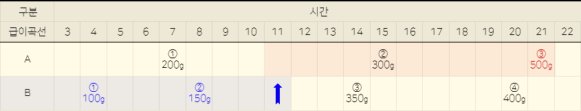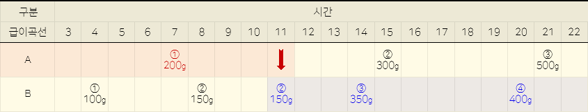 다수의 곡선 지정형 급이곡선 목록 - 2회차 급이 이후 급이곡선 변경시, 신규 급이곡선의 2회차가 예정인 경우 11:00 B→A로 변경 시, 곡선B의 2차(08:00)가 이미 토출되었으므로 곡선A의 3차(22:00)가 설정시간에 토출